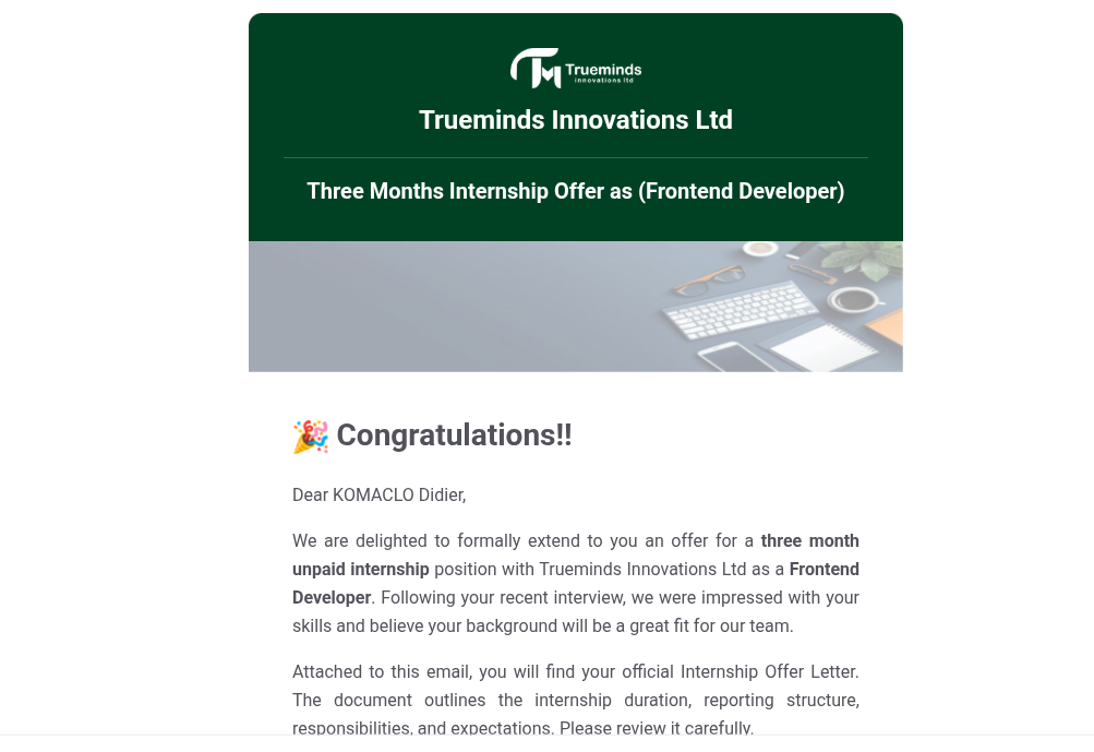 Je suis ravi de partager que j'ai reçu une offre de stage de 3 mois en tant que Développeur Frontend chez Trueminds Innovations Ltd ! C'est une opportunité fantastique de mettre en pratique mes compétences dans un cadre professionnel et d'apprendre auprès d'une équipe talentueuse.
